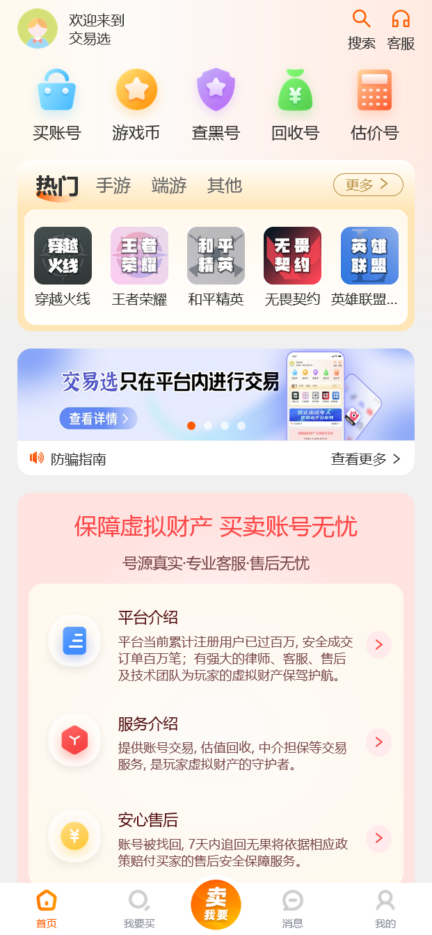 交易选是专业游戏账号交易平台,秉承让游戏与账号相结合的理念,在购号的同时结合当下最安全的交易玩法,打造安全多样化游戏交易平台。